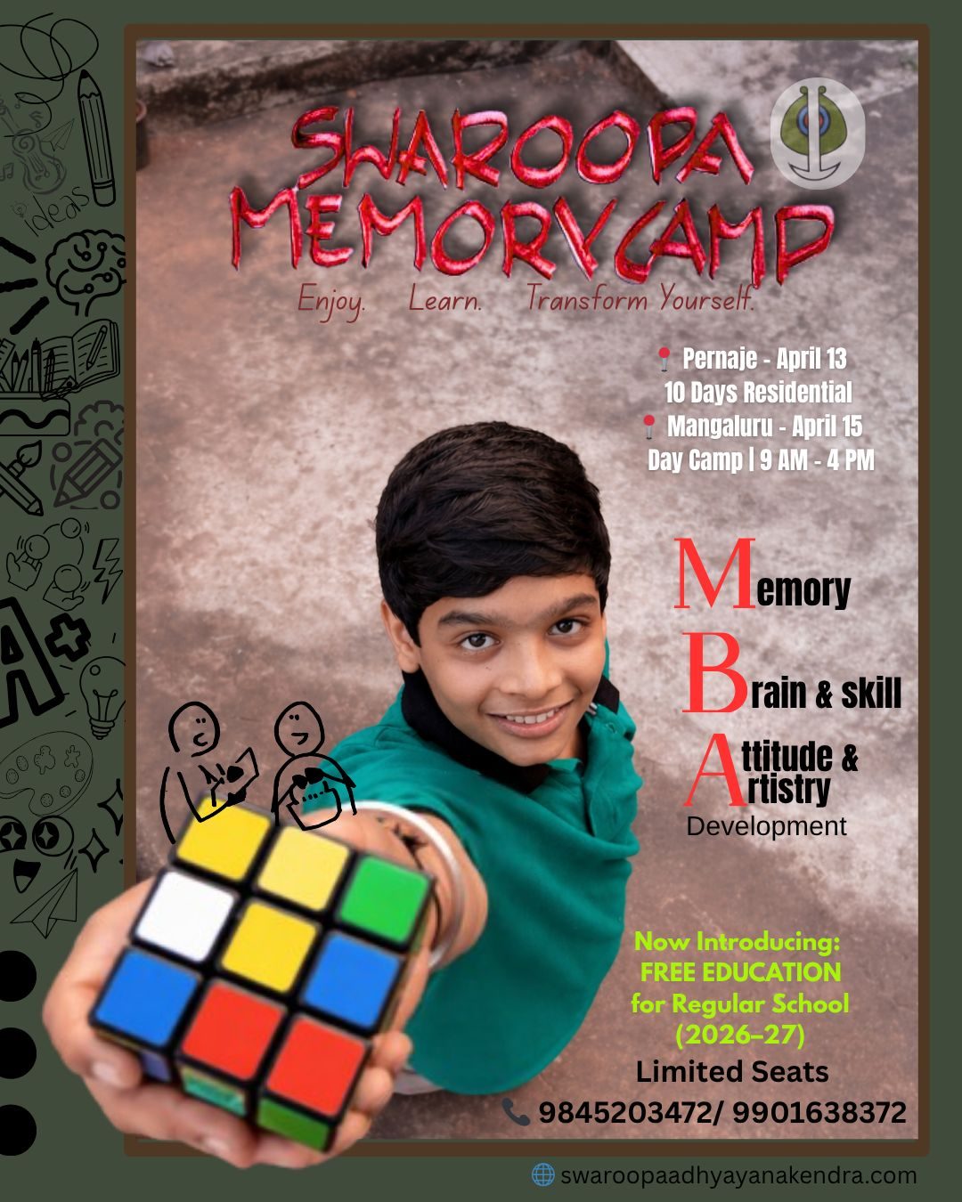 Swaroopa Infant Education system, Swaroopa Alternate Composite Education– are some sections under this Kendra. Swaroopa–For Health, Life, and Education – this concept helps a person to enjoy his life and be an achiever. Thousands of Camps for children were conducted by Swaroopa Adhyayana Kendra. Counselling is given to all the people of any age. For students and parents there is a separate Swaroopa Training (on the basis of Voice and Expression) Ten Master Techniques of memory is a package designed for S.S.L.C students. There is a great demand for Swaroopa Memory Therapy.